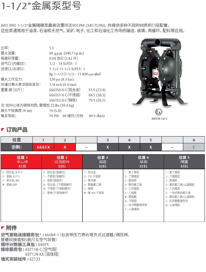 1?" Pro系列金屬泵6661XX-XXX-C90 GPM (340.7 LPM)最大流量 gpm (lpm):90 (340)最大工作壓力 psi (bar): 120 (8.3)結構材質: 鋁合金, 不銹鋼, 鑄鐵可通過最大懸浮固體直徑 in (mm):1/4 (6.4)最大干吸高度 ft (m): 19 (5.8)常用配置:666170-3EB-C;666170-144-C66617B-244-C;666172-3EB-C?